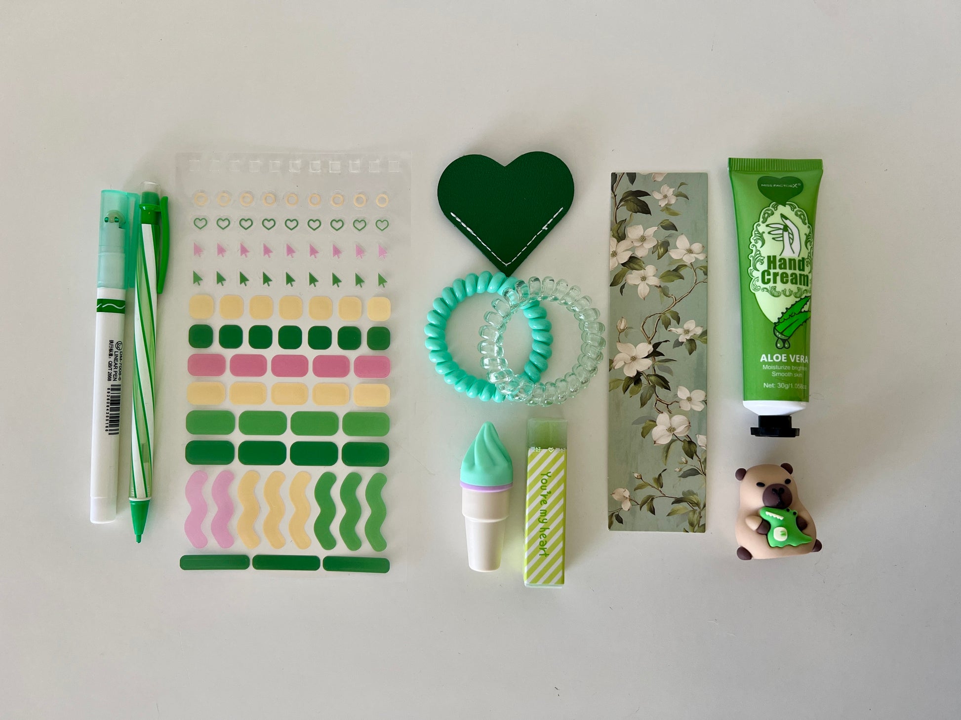 You will receive randomly selected stationery/self-care items in GREEN, in your chosen quantity of either 10, 15 or 20 items. Items may include: